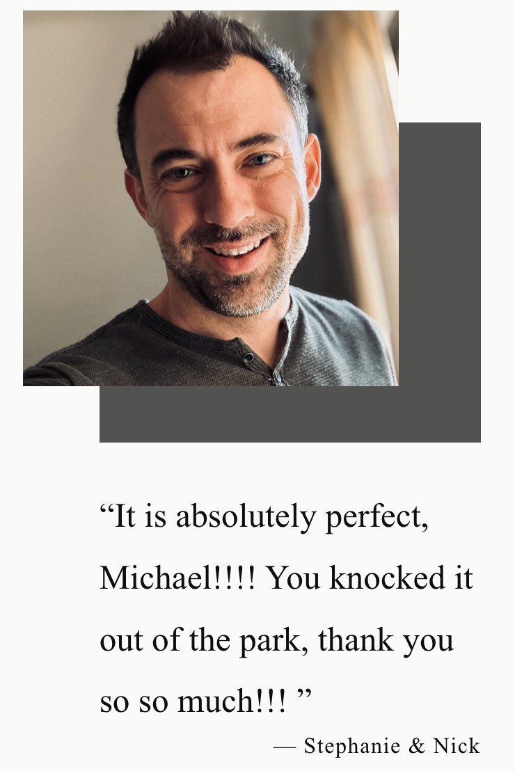 “Michael does an amazing job! We had heard from so many of our friends how much they loved having a videographer or had wish that they had had one. Michael met with us, got to know our needs, and we were so excited to have him on our special day. Videos are only as good as the quality, composition, music, and storytelling and Michael does the most amazing job of weaving all of those elements together. We could NOT be happier as customers of FILMS ABOUT LOVE!”